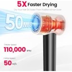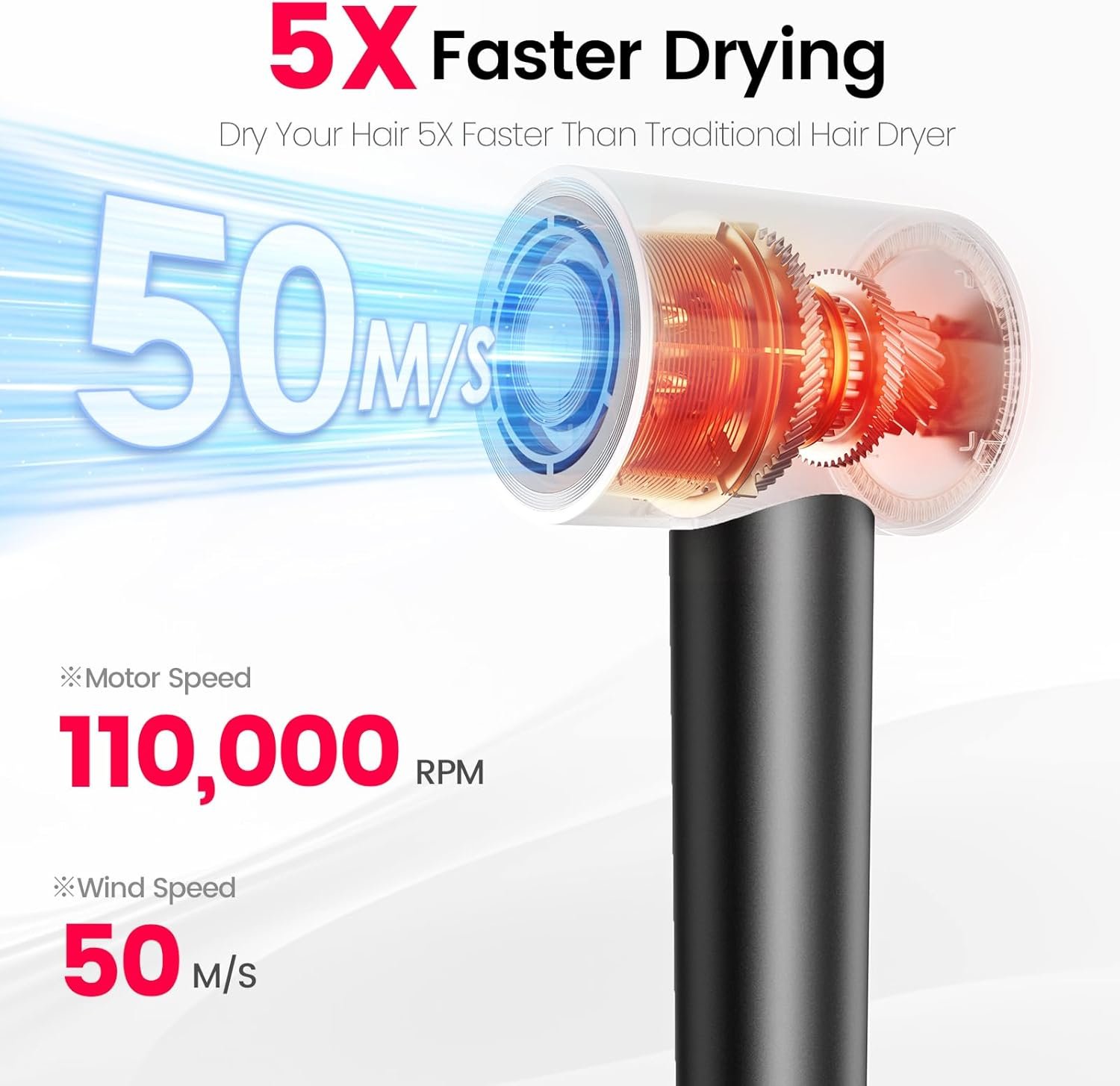 Ultra-Fast Drying: AirJetz diffuser hair dryer is equipped with a 110,000 RPM high-speed brushless motor, providing a strong wind speed of up to 50 m/s. It only takes 2-5 minutes to dry hair, which is 5x faster than traditional hair blow dryer, makes your hair care routine efficient and enjoyable.