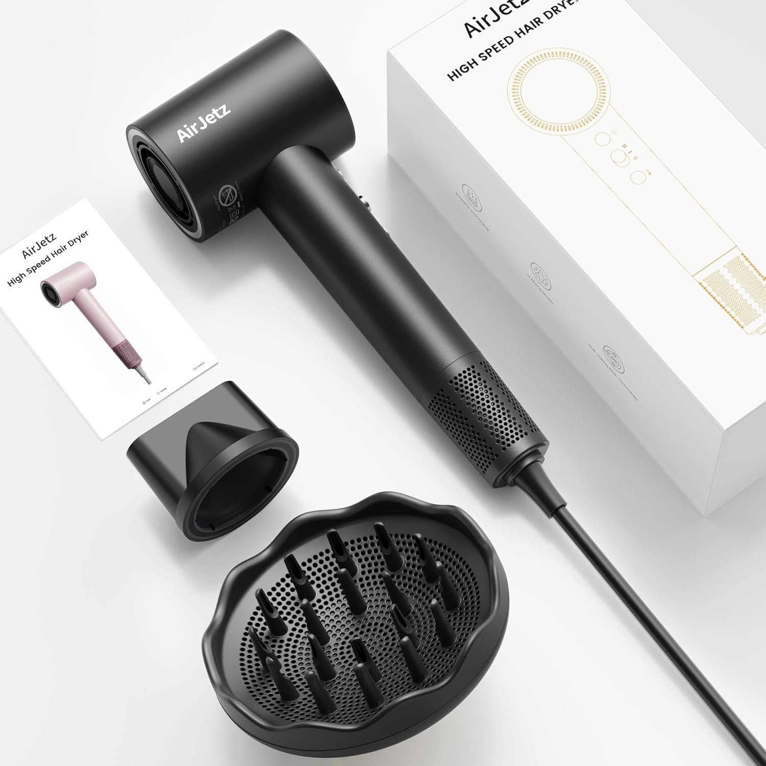 Be the first to review “AirJetz Hair Dryer, 110,000 RPM High-Speed Ionic Blow Dryer for Fast Drying, Professional Lightweight Hairdryer with Diffuser, Magnetic Nozzle, 4 Temps & 2 Speeds, Low Noise for Travel – Black” Cancel reply