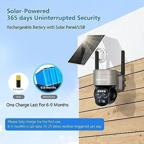 【Solar Powered & 100% Wire-Free & 5dbi Dual Antennas】BEENOCAM cameras for home security outside built with solar panel and 15000mAh rechargeable battery, providing 365 days non-stop power supply. 100% wireless, no circuit wiring hassles or external Installation fee, set up solar camera freely anywhere, like a shop, home, garage, yard,hotel, outdoor. Upgraded 5dBi dual antenna ensure more stable and stronger wifi. Real-time videos are smoother, clearer. Only supports 2.4Ghz WiFi not 5GHz.