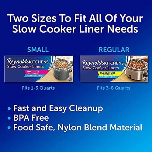 Make memorable meals with Reynolds Kitchens Slow Cooker Liners, and save time on cleanup. Grab these slow cooker bags for slow cooking without dealing with stubborn, stuck-on messes. Each slow cooker bag measures 13 x 21 inches to fit 1- to 3-quart round and oval slow cookers, and is made with a BPA-free heat resistant (up to 400 degrees Fahrenheit) nylon-blend construction. Spend more time with your loved ones and less time in the kitchen with these FDA-compliant, food-safe Reynolds Kitchens Slow Cooker Liners.